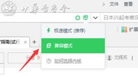 具体方法是查看360浏览器网址输入框的右侧,点击 “e”图片,出现下拉框,点击绿色小闪电符号,即可从兼容模式转为极速模式: