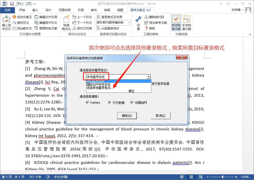 2.选择目标著录格式(比如您是中华医学杂志审稿老师,则在此处选择文献王中的中华医学杂志);根据文中内容,软件会自动选择参考文献数据库PubMed、万方和知网,您也可以手动添加或减少参考文献数据库。